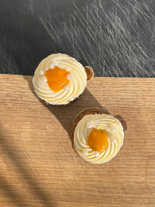 Nadýchaný mrkvový korpus s pekanovými ořechy, vanilkový krém, mango gel