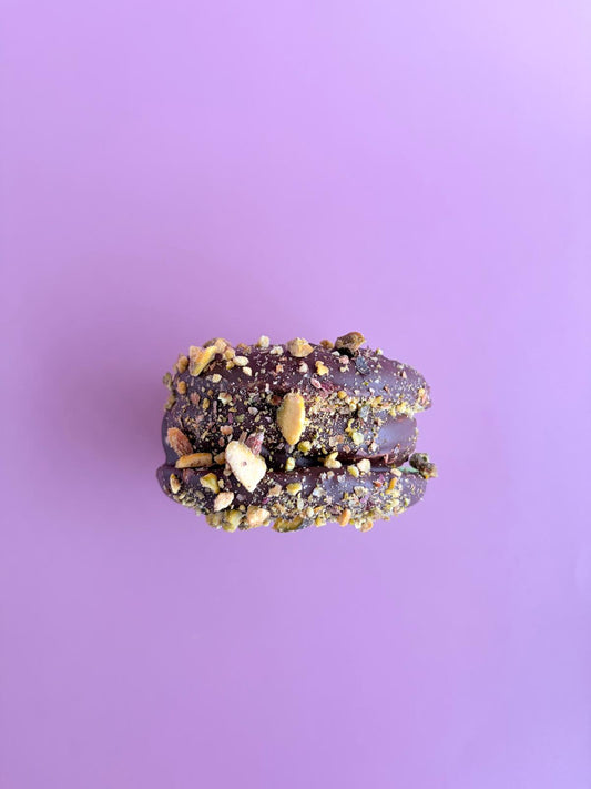 Pistáciová šlehaná ganache, křupavá náplň s kadaify, čokoládová poleva